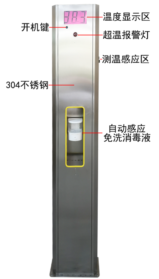 具有高精度和高分辨率,对环境和日光免疫,干扰小,室温下测量误差±0.1℃。初始温度设定值为 37.3℃(可调节),检测门工作时显示检测出的人体实际体温超过 37.3℃即报警。行人测温后,可伸手探入消毒机下方,自动感应后滴出免洗的消毒液,从而达到消毒效果,避免手中的病毒不断到处传染。