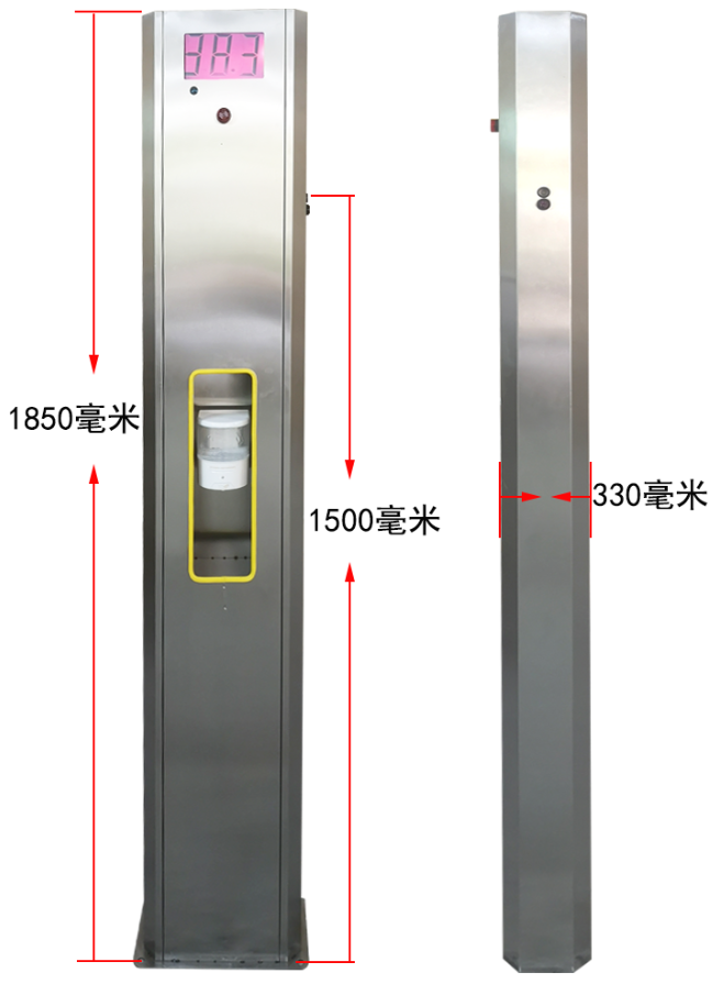 4. 消毒:本设备配备了一台自动感应消毒机,当行人检测结果属于正常体温后,行人把手伸入自动感应消毒机下方,手部由下至上,自动感应消毒机滴出消毒液,行人搓拭手部后即可离开。
